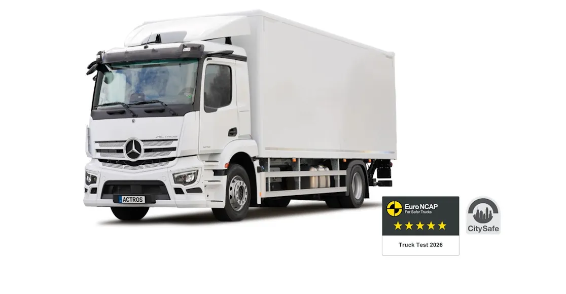 Mercedes-Benz Trucks hefur hlotið fimm stjörnu einkunn í nýjustu öryggisprófunum frá Euro NCAP fyrir þungaflutningabíla í svæðisbundnum dreifingarflutningum. Prófaður var Actros 4x2 Rigid með kassa, sem náði heildareinkunn upp á 88%.