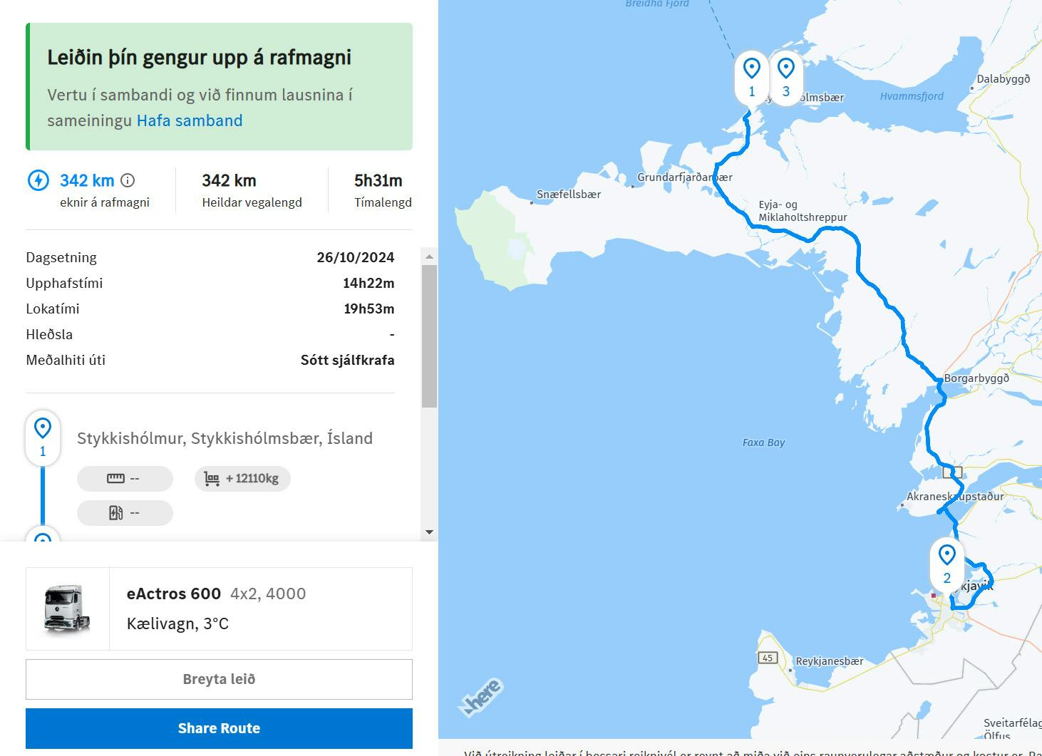 Reiknivél frá Mercedes-Benz Trucks þar sem hægt er að reikna drægni miðað við ákveðnar forsendur er nú aðgengileg á vefnum. Reiknivélin er á íslensku og mjög einföld í notkun. Reiknaðu þína leið og sjáðu hvort rafmagnið er fyrir þig. Hlekkur hér að neðan!